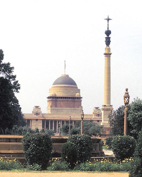 ラーシュトラパティ・バワン (旧・インド総督官邸、現・大統領官邸)、ニューデリー、1929年 イギリスの建築家・エドウィン・ラチェンズはヨーロッパ主義者であったが、 インド総督の要望を受け入れて、パラディオ風の建築に インド・サラセン様式を取り入れた。 ここでは、頂部のドームが サーンチーのストゥーパを模している。