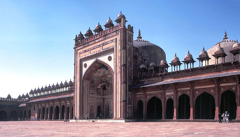 モスク地区のジャーミ・マスジド(金曜モスク)、ファテプル・シークリー、1571年 アクバル帝がチシュティー教団のスーフィー、サリーム・チシュティーに献じたモスクで、 境内にはその聖者廟もある。 その廟以外のすべてが赤砂岩で建てられている。