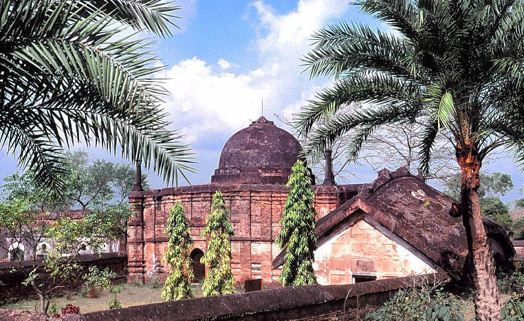 単一ドーム屋根の カダム・ラスール・モスク、ガウル、1530年 四隅にミナレット状の小塔を立てている。 手前に見えるのは 17世紀のイスラーム時代の ファテーフ・ハーン廟で、より忠実に民家形式をなぞっている。
