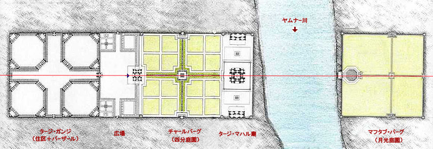 The great regional plan of the Taj Mahal Complex continuing to the Mahtab Bagh (Moonlight Garden) in Agra.
