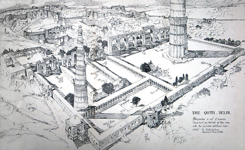デリーのクトゥブ・モスク・コンプレクス、A.S.I. のゴードン・サンダースンによる鳥瞰透視図。 左側にクトゥブ・ミナール、右側に 完成した場合のアラーイ・ミナール、 右奥にアーチ・スクリーン、左手前がアラーイ門。(第2次拡大部分の回廊による仕切りは 作図の誤り) ( from Archaeological Survey of India, Annual Report 1912-13, 1916, Calcutta )