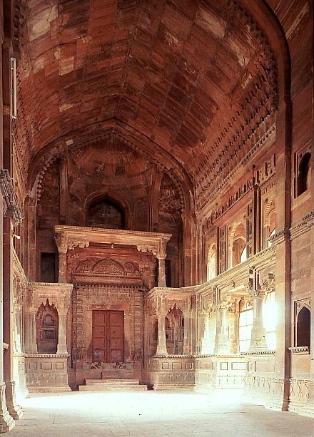イスラーム建築の影響を受けた ゴーヴィンダデーヴァ寺院の内部、1590年、ブリンダーバン 尖頭アーチによるヴォールト天井が覆うモスクのような大空間は、それまでの ヒンドヒンドゥ寺院にはなかったものであり、神像彫刻もまったく見られない。