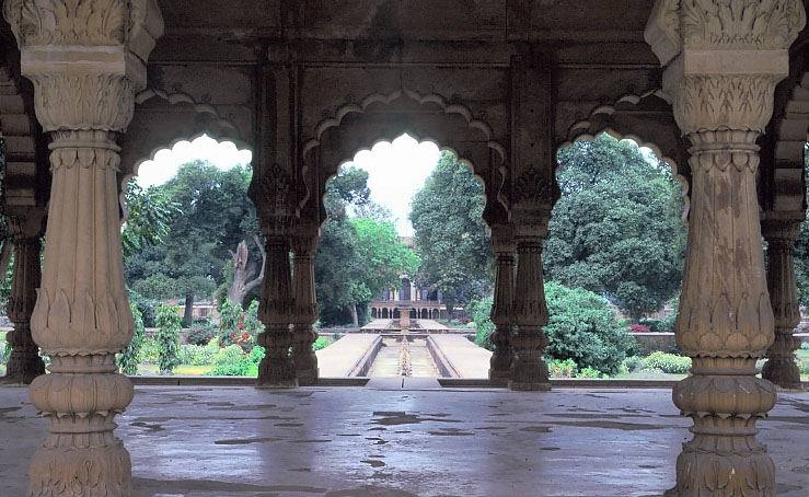 広大なディーグの市内宮殿における、開放的な大園亭としてのケシャヴ・バワン、1760年頃。 イスラーム的な四分庭園を囲んで、宮殿群が幾何学的に配列されている。 ラージプート建築に特徴的な柱の造型は ムガル宮殿から受け継いだもの。