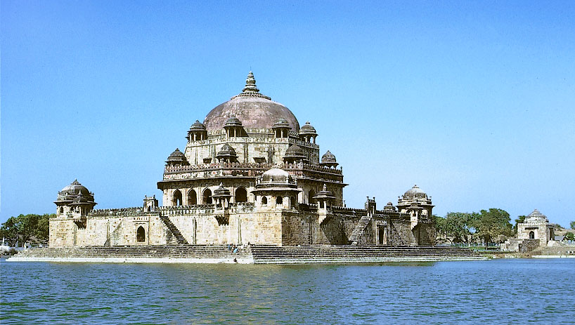 湖上に浮かぶように建つ シェール・シャー廟、1626年、ササラーム 基壇の四隅と、八角形の廟の二層の各隅部にチャトリが林立して、実に華やかである。 建築家イラーワル・ハーンの失敗か、「島」と基壇の角度がずれたことが、逆に躍動感をもたらした。