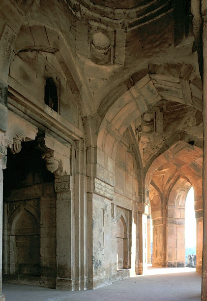 シェール・シャー廟の 八角形に折れ曲がる回廊、1626年 視覚的にはまだアルカイックな印象を残すが、構造的にはアーチの 原理による堅固なイスラーム建築である。ただ、左の墓室への 入口フレームのみが、ブラケットなど ヒンドゥ的である。