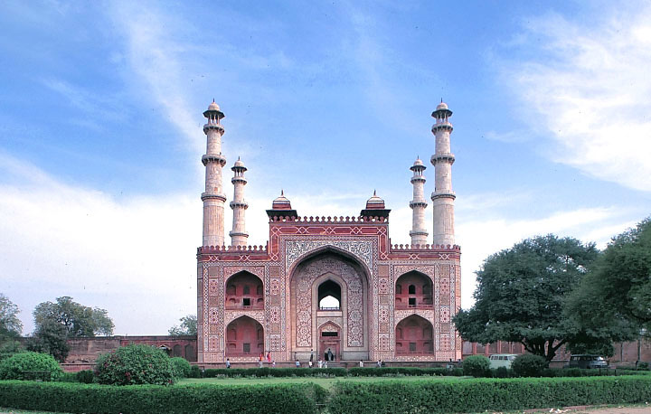 4本のミナレットを立てる、アクバル廟の南の楼門、1613年、シカンドラ。 壮大な門の奥に 700m角の四分庭園がひろがり、その中央にアクバル大帝の廟がある。 赤砂岩の壁面は、白大理石と他の色石の象嵌細工で くまなく装飾されている。