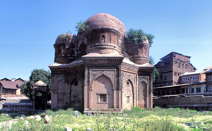 ザイン・アルアビディーンの母の廟、1430年頃、シュリーナガル。 純ペルシア的な組積造レンガ建築で、インド的な要素は ほとんどない。 珍しい十字形プランをしていて、かつては彩釉タイルで カラフルに化粧されていた。