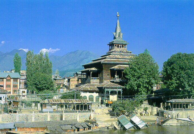 ジェーラム川のほとりの シャー・ハマダン・モスク、シュリーナガル、18世紀 木造の立方体の上に鋭い尖塔屋根という、世界に珍しい、カシュミール独特の様式のモスク。 この形態は、中世の石造ヒンドゥ寺院、ひいては古代の木造仏教寺院から受け継いだと考えられる。