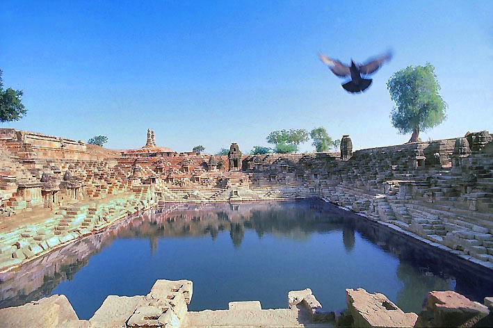 モデラーのスーリヤ寺院に付属する 階段池(クンダ)11世紀 階段の上部で 52.8m× 36m あり、周囲に約 70もの小祠堂が階段に組み込まれている。 信者や巡礼者のための単なる沐浴池ではなく、種々の宗教的祭儀に用いられたのであろう。