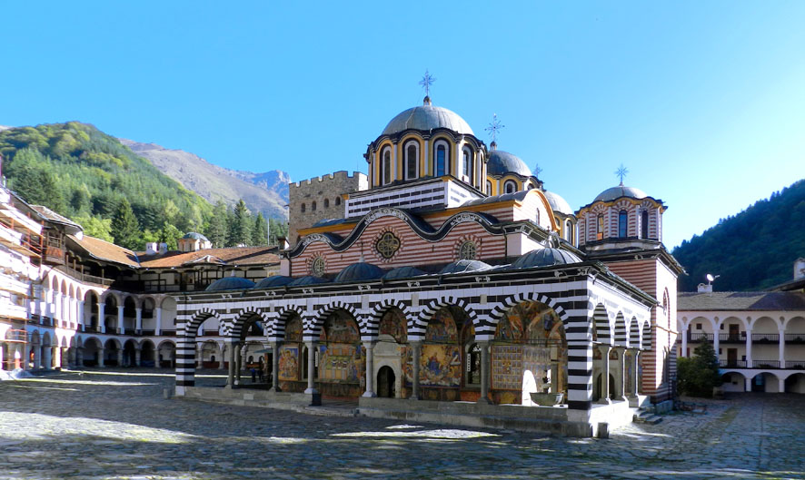 ブルガリア正教の本山、リラ修道院 きわめて派手なビザンティン様式の建築作品で、写真移りがよく、 ユネスコ世界遺産にも登録されているので、世界的によく知られているが、この派手さは すべてペインティングによるものなので、実際の建築的感銘は、それほど大きくない。