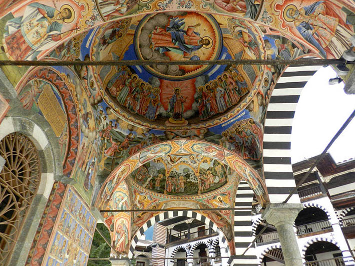 聖堂内部はもちろん、周囲の回廊まで極彩色の宗教画で埋め尽くされている。