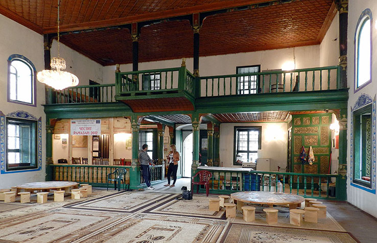 ヴィディンの オスマン・パズヴァントール・モスク 天井はドームではなくフラットで、木造の網代仕上げとなっている。 例によって入口側に木造の中二階があり、女子用の礼拝室となっている。 さらにこの手前に前室があり、そこに階段がある。