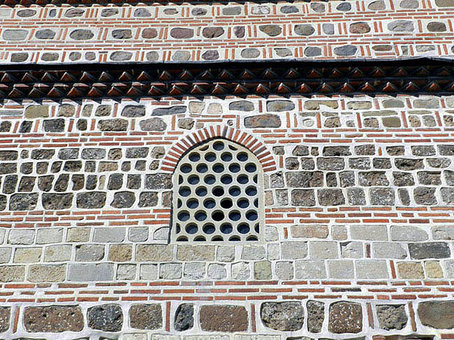 ヤンボルのエスキ・モスク ブルガリアのイスラーム建築の壁面構造、かつ仕上げの典型。 組積造というよりは、モルタルの中に石とレンガを規則的に埋め込んでいった印象で、 シリアやアルメニアの、精巧な切石積みの建築とは大いに異なり、ギリシアのビザンティン様式に近い。