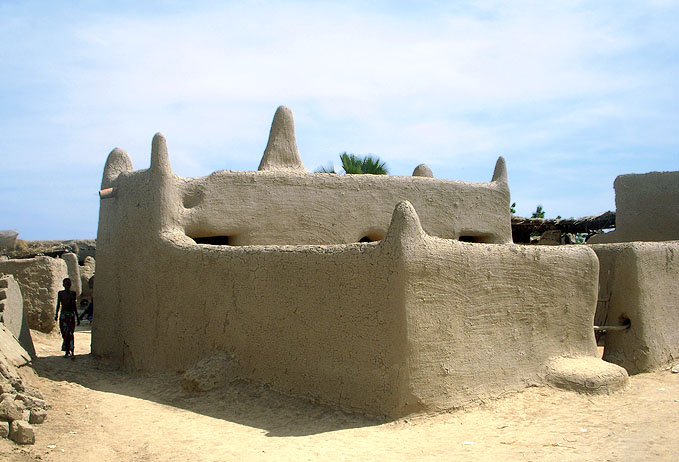 ウェリンガラ村のモスク。 通常はこのように家々に囲まれて建つ。 ミフラーブの上に高い角を立て、塀と建物の隅部に低い角を立てる以外、一切の装飾がない。 中庭への入口の左に必ず小壇があり、外部でのイマームの説教壇となる。