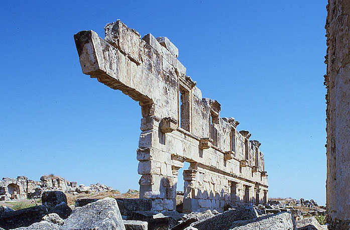 アパメアの建物址 列柱街路(カルド・マクシムス)に面した建物(おそらくは商店や住居)の遺構。 大開口部の「まぐさ」としての水平アーチが、左側の壁が失われたにもかかわらず、 接着モルタルが硬化して、崩れないでいる。右側には1階に小開口部、2階に窓が並ぶ。 左後方の別の建物ではアーチが用いられている。後世のキリスト教聖堂か?