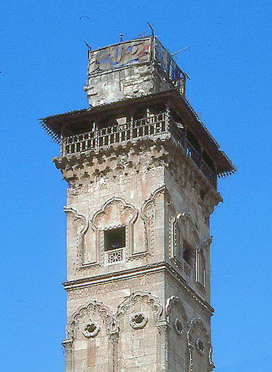 アレッポの大モスク(金曜モスク)のミナレット ミナレットの頂部を、隣のハラウィーヤ学院の屋上より撮影した。 最上階には、ムアッジン用に 木造のバルコニーがまわっていた。 The upper part of the Minaret of the Great Mosque in Aleppo, 715 (photoed from the rooftop of neighboring al-Halawiyya Madrasa)
