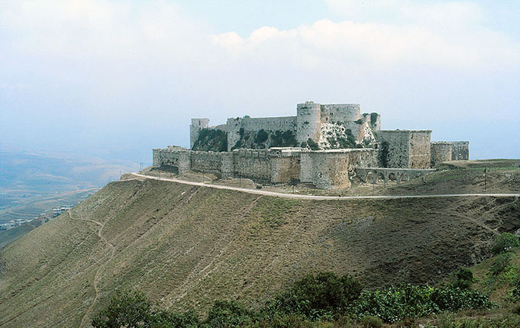 海抜 600m の丘上に建つ十字軍の城塞、クラック・デ・シュヴァリエ。 1142年から 130年あまり、ホスピタル騎士団(聖ヨハネ騎士団)によって守られたので、 ホスピタルの城とも呼ばれた。 難攻不落を誇ったが、 1271年にマムルーク朝のバイバルスによって陥落させられた。