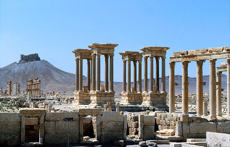 パルミュラの列柱街路と四方門(テトラパイロン) カルドとデクマヌスが交差するところに建つ四方門は、1963年にシリア考古局によって 再建された。オリジナルの柱はエジプトのアスワーン産のピンクの大理石だった。 かつては 4つの4本柱の小建物内に、それぞれ賢人などの彫像が立っていた。 この珍しい遺構も、イスラム国 (IS) によって 2017年に爆破された。