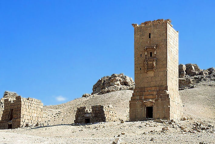 内部が5層のヤンブリク家の塔墓(83年)と、崩壊した塔墓群