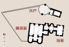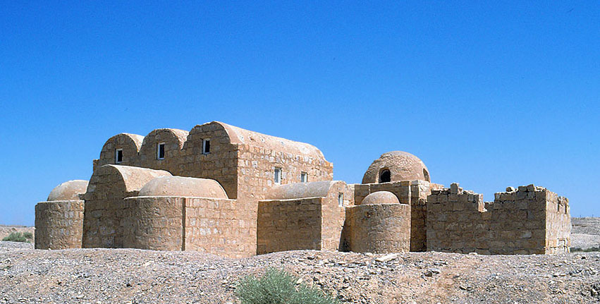 クサイル・アムラ「砂漠の城館」の浴場、715年、ヨルダン 建物全体は ほとんど開口部がなく、きびしい表情と 飾り気のない 幾何学立体の外観を見せている。 クサイル・アムラの平面図 (From "A Short Account of Early Muslim Architecture" by KAC Creswell, 1989) ハリーファ・ワリード1世によって建てられた。