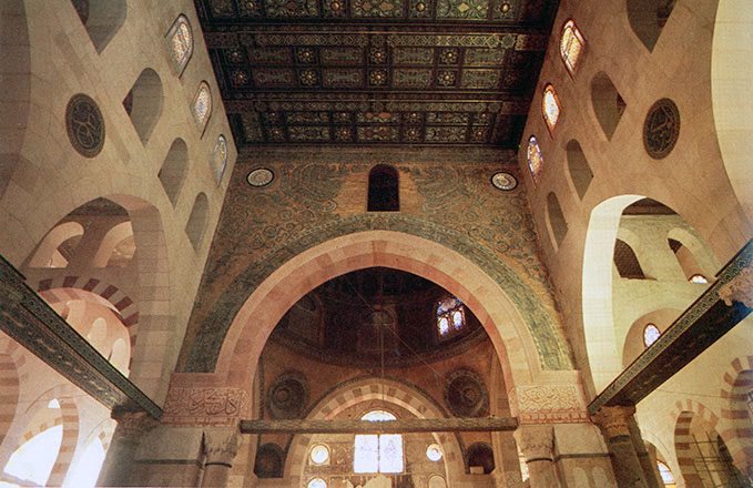 イェルサレム、アクサー・モスク内部 (アンリ・スチールラン『イスラムの建築文化』1987 より) 横断アーチの奥がドーム天井で、アーチ上の壁とともにビザンティンの モザイクで飾られているのは、岩のドームと同様である。 (十字軍の手から奪還したサラーフ・アッディーンが修復した)