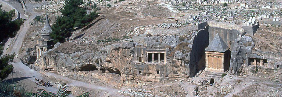 左からアブサロムの墓(塔)、ベネイ・ヘジール家の石窟墓、ザカリヤの石彫墓。