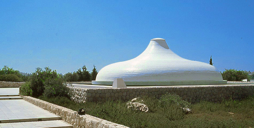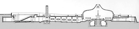 イスラエル国立博物館、聖書の殿堂、フレデリック・キースラーとアルマンド・バルトスの設計 仕上げは、白いモザイク・タイルである。 聖書の殿堂、断面図 (from a web site)