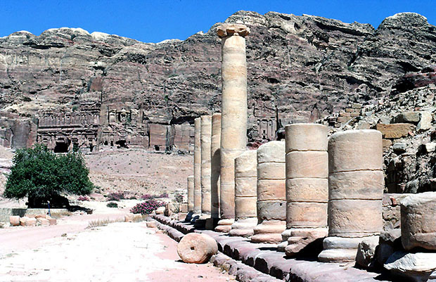ペトラの都市遺跡、都心中央の列柱街路、106年。 列柱街路の長さは、225m。 この周囲には、 石造の建物がたくさんあったが、今はほとんど残っていない。 向こうの岩山に 多くの摩崖墓が彫られているのが見える。