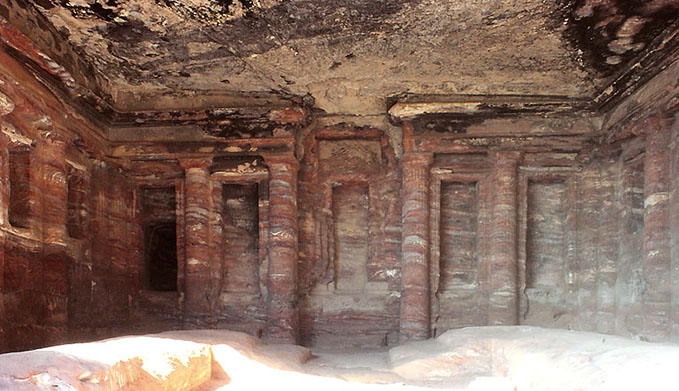「トリクリニウム」と呼ばれる石窟の内部。 壁面が豊かに彫刻された 唯一の石窟。