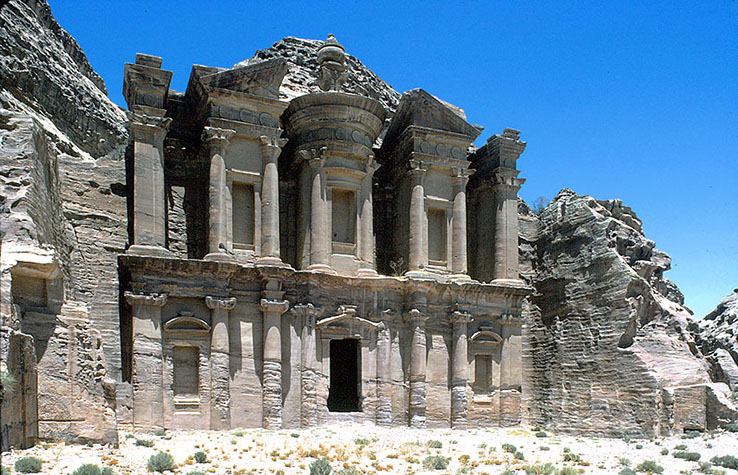ペトラの遺跡、「アッデイル」Al Deir(僧院)と呼ばれる石彫葬祭殿。 最大の遺跡で、高さは約 40m、幅は約 46m。 ビザンティン時代に 僧院に用いられていたらしい。 形式は 「ファラオの宝庫」 と同じで、2階中央に ロトンダ(円堂)、左右に 三角切妻を二つに割った堂。