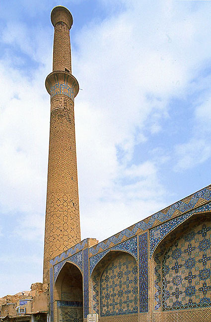 イスファハーンのアリー・モスク・ミナレット サルバン・ミナレットに並ぶ、イスファハーンで最も背の高いミナレットの一つ。 各層でタイル目地のパターンを変えているが、バルコニーはムカルナスではなく、 滑らかな曲面で持ち出されている。