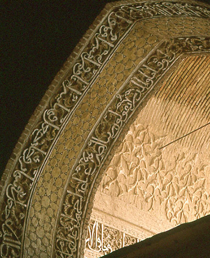 ミフラーブ前のベイから窓開口を通してイーワーン天井を見る。