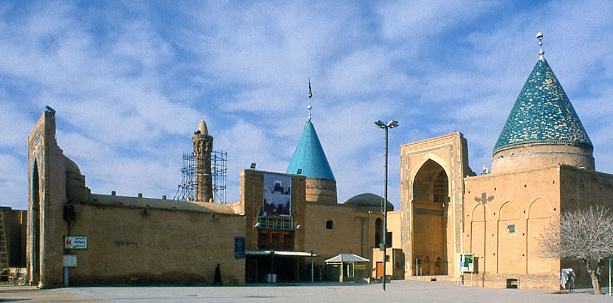 ビスターム(バスターム)のバーヤジード廟コンプレクス 右側がバーヤジード廟、左側が全体の入り口をなすイーワーンとギャラリー。 奥にミナレットと、シーア派・イマーム派の第6代イマームだった ムハンマド・イブン・ジャーファルの廟の円錐屋根が見える。