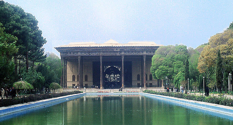 チェヘル・ソトゥーン宮殿(四十柱殿)、イスファハーン(イラン) 木造ターラ-ルの実際の柱は20本であるが、 池に姿が映るので、合計40本の柱と みなした命名。 Chehel Sotun Palace (Forty-Culumns Palace) in Isfahan, Iran The Talar has only 20 columns, but they are reflected in the pond.