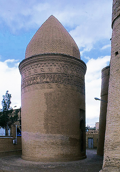 ダームガーンのチェヘル・ドフタラン廟、セルジューク朝の11世紀 イランの墓塔形式の模索期で、レンガ造の壁面にはリブが無く、 屋根が砲弾形をしているのが珍しい。 Chehel Dokhtaran Tomb Tower .