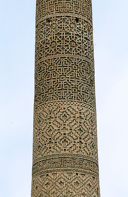 イランの円筒形壁面のレンガ積みパターンが 最も華やかな 初期のミナレットのひとつ。