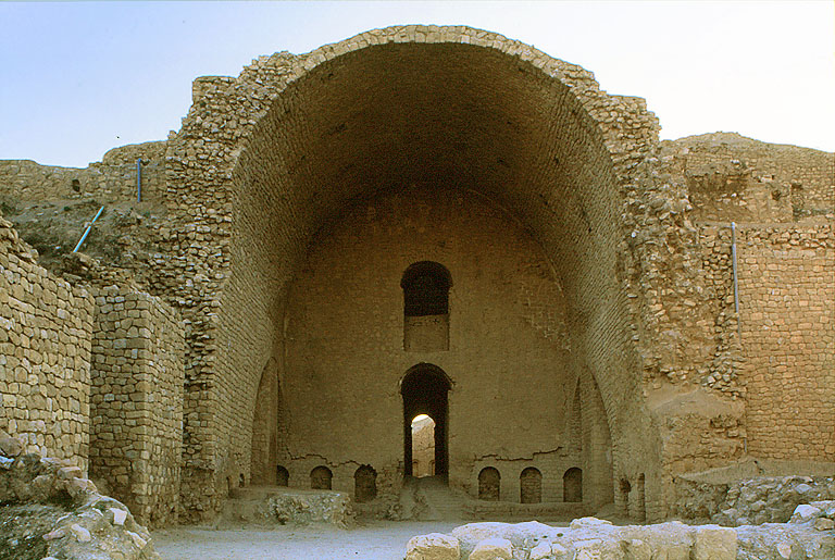フィールーザーバードの アルダシール宮殿遺跡(イラン)3世紀。 ササン朝ペルシアの アルダシール 1世(在位 226-240)が建てた 宮殿址。 大イーワーンが残り、後のペルシア型モスクの イーワーンの 原型のひとつと考えられる。(ヴォールトの手前半分以上は復元工事)