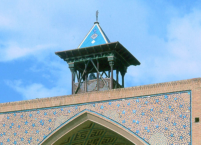 イスファハーンのハキーム・モスクのマーゼネ Maazeneh 四イーワーン型モスクでは、マッカ側のイーワーンの上にミナレットが立つが、ムアッジンが アザーンを唱えるのはミナレットではなく、東側イーワーンの屋上のマーゼネからである。 そうなると、ミナレットは用途のない、単なる飾りになってしまう。