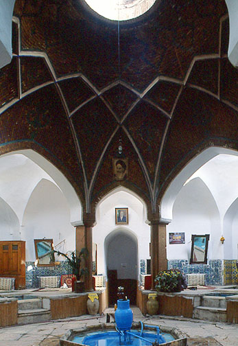 カーシャーンの、古いハジ・サイイド・フサインのハンマームの中央ホール Hammam of Haj Sayyid Husain サファヴィ朝の17世紀の創建。 今は豪華なティー・サロンに改装されて保存されているらしい。 この写真は、ハンマームとして使われていた 1907年の撮影。