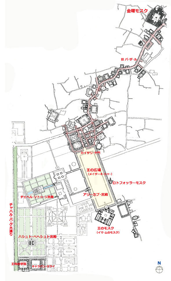 広場から バーザールの入り口となる所に『カイサリーヤ門』、広場の西側に『アリー・カプー宮殿』、東側に『シャイフ・ロトフォッラー・モス』、そして広場の南側に 最大の『王のモスク』を造営した。モスクは 皆 マッカ(メッカ)の方向(キブラ)に向かっている。広場と、公園のような 巾広のチャハル・バ-グ大通りの間には チェヘル・ソトゥーン宮殿(四十柱殿)と ハシュト・ベへシュト宮殿(八楽園)が造営された。大通りは もっと南に延び、ザーヤンデ川に達する。川の反対側には 多くの庭園が並んでいた。近代の市街は この地図の南側に発展し、現代の市街は 川を越えて延び広がり、ニュー・ジュルファ地区をも 飲み込んでいる。