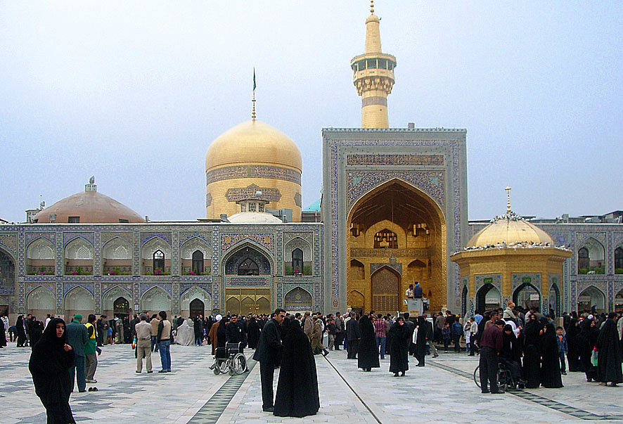 イマーム・レザー廟コンプレクスの 古くからの中庭 Enghelab Courtyard、マシュハド 毎日、参拝者が群集のように押しかける。黄金のドームの下がイマームの廟 Holy Shrine、 そこへの入り口が黄金のイーワーン。その後方に黄金のミナレット、 さらに後方に ゴハルシャード・モスク Goharshad Mosque がある。 参拝者は 三方の入口から この古中庭に入り、ここから各目的空間へと行く。