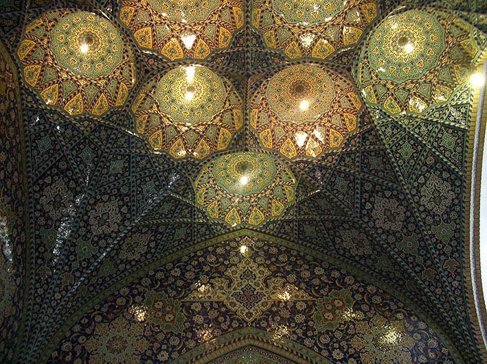 マシュハドのイマーム・レザ−廟、モスクや廟など、黄金の天井や極彩色の天井、 モザイク・タイルの天井、鏡張りの天井と、さまざまに豪華絢爛な天井のうちの一つ。 それらの空間を巡り歩くと、なるほどイラン人というのは こういう好みなのかと、納得する。 「巧緻」ではあっても、「渋好み」とか「侘寂(わびさび)」「幽玄」とは 対極的な美感覚である。