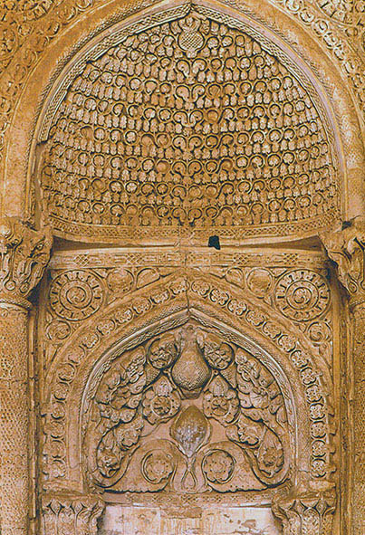 ミフラーブはスッタコ彫刻による古拙な植物紋で飾られている。