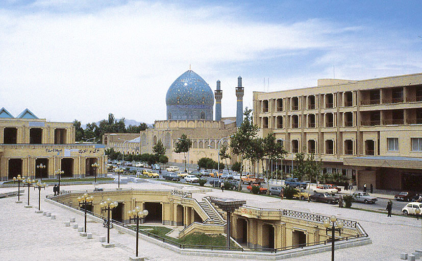 イスファハーンの王母の学院とキャラバンサライ この地区全体が再開発されて、キャラバンサライはアッバーシー・ホテルに転用されている。 手前は 地上2階、地下1階の、20世紀のバーザール(高級ショッピング街)