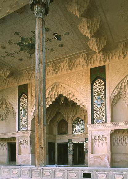 木造柱が2本立つエイヴァーン、スタッコ・ムカルナスで飾られたイーワーン