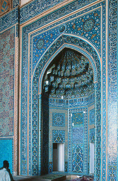 青を基調とする彩釉タイルで覆われたミフラーブ。
