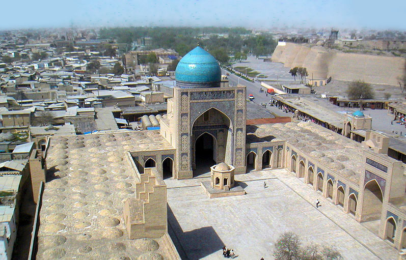 ペルシア型モスク カラーン・モスクの中庭、1514年、ブハラ(ウズベキスタン) マッカ側のイーワーンの奥にシンボリックにドーム屋根を載せるが、 トルコ型のように 礼拝室全体を覆うような 巨大なものではない。