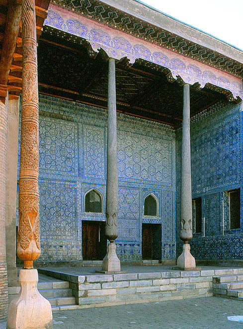 ヒヴァのイチャン・カラ、クフナ・アルク(古城)内、 近世の宮殿建築の典型、クリニシュ・ハーナのアイヴァーン, 1804-6 独立柱が鉛直荷重を支えるだけのピン柱であることを、常に表現している。 ここは気候の良い季節の謁見の場であり 団らんの場で、この奥に王座の部屋があった。 The colonnaded Aivan of the Kurinysh Khana in Kukhna-Ark, Khiva's Ichan-kala