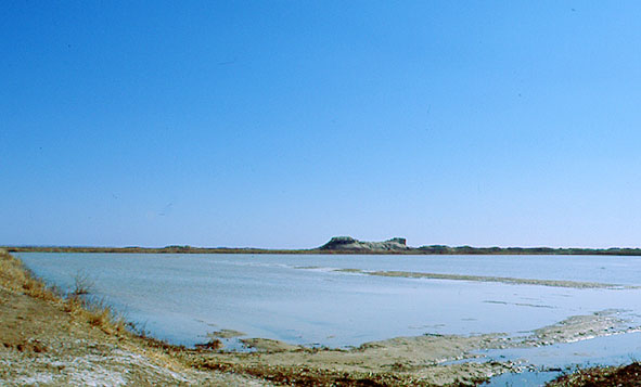 雨が降ると、周囲の砂漠のような平原が冠水する。