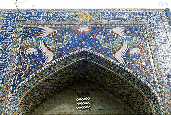 ラビ・ハウズ・アンサンブルの内、ナーディル・デワンベギ学院 イーワーンの上部壁には、 2羽の 鳳凰のような鳥が タイル・モザイクで描かれている。 サマルカンドのレギスターン広場におけるシール・ダール学院のライオン像と並ぶ、珍しい作例。